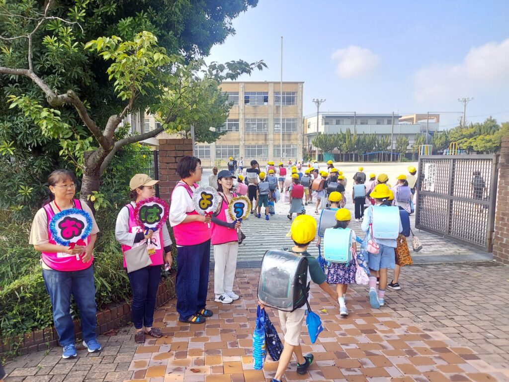 暑さが厳しい中、いよいよ2学期がスタートしました。手作りの「おはよううちわ」を持ったPTA役員が正門と北門に立ち、たくさんの荷物を持って登校してきた子どもたちと元気に挨拶を交わしました。楽しい行事が盛りだくさんの2学期、みんな元気に過ごせますように!