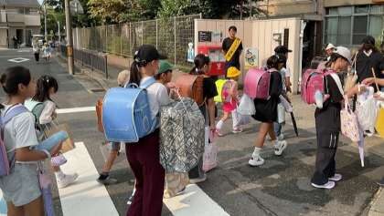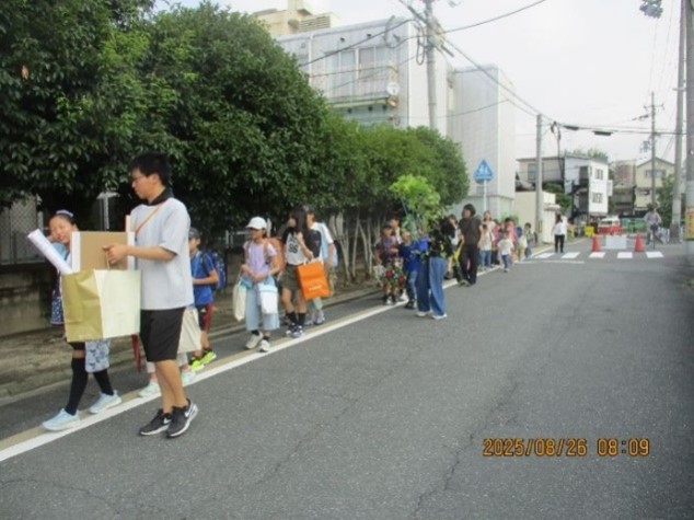 楽しかった夏休みの思い出を胸に、また、手には夏休みの自由作品をもって子どもたちの元気な声が学校に戻ってきました。集団登校のリーダーの高学年の児童が低学年の児童の様子を見ながら安全に気をつけて登校しています。